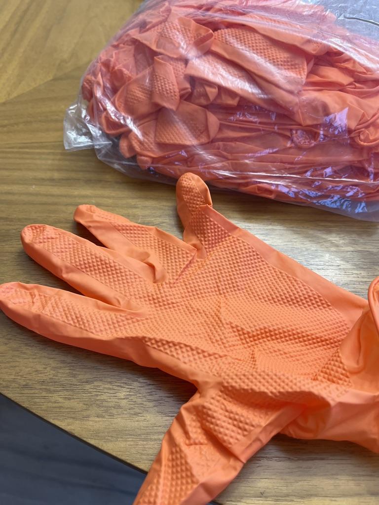 Nitrilové rukavice, opravdu velmi pevné, velikost seděla 👍.( M ). Oranžová barva. Celkem 10 kusů. Koupila jsem za 287 ₽.