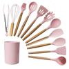 12dílná sada kuchyňského náčiní s žáruvzdorným nádobím, dřevěnou rukojetí a držákem, špachtlí, lžící, štětcem a metlou.