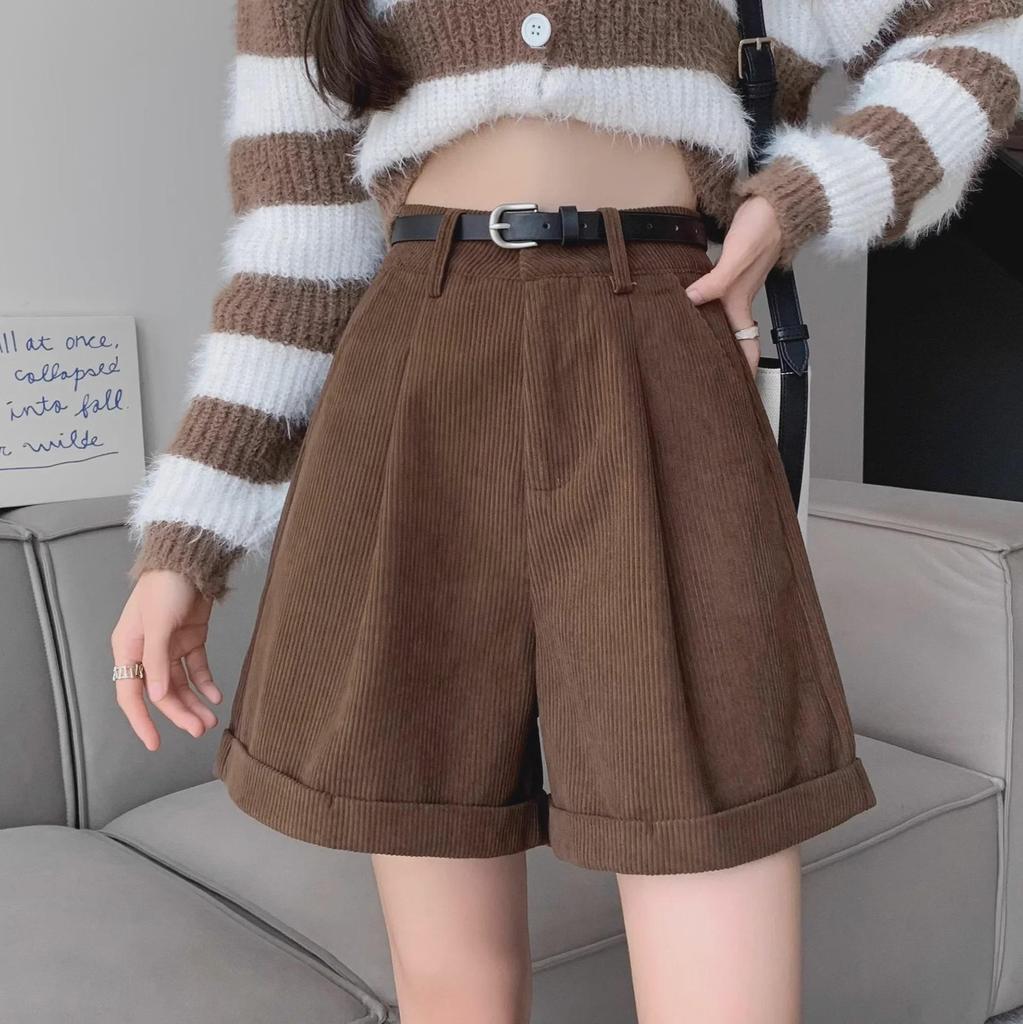 Dámské hnědé manšestrové kraťasy s vysokým pasem - zeštíhlující, široké, áčkové, ideální na podzim/zimu 2023