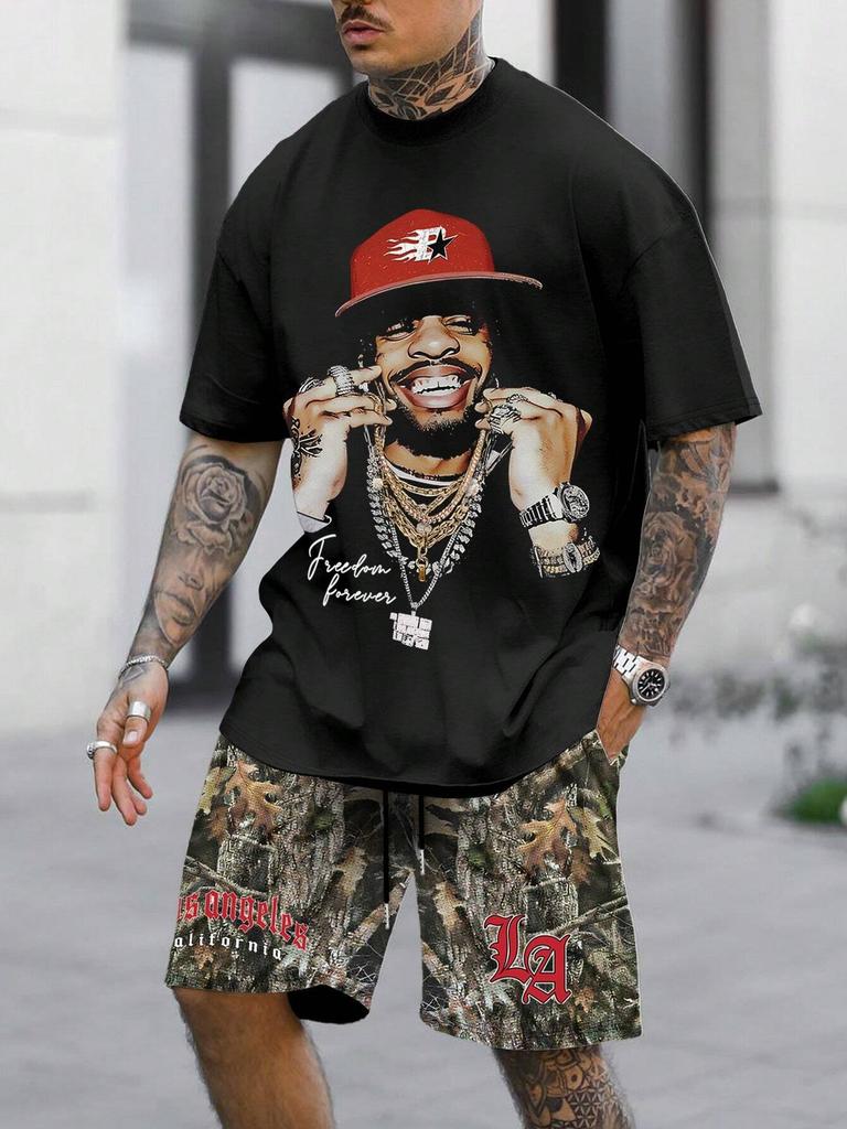 2dílná letní pánská hip hopová sada s 3D grafikou a kulatým výstřihem, krátkým rukávem a neformálním topem a kraťasy, Y2K Streetwear, fitness, běhání