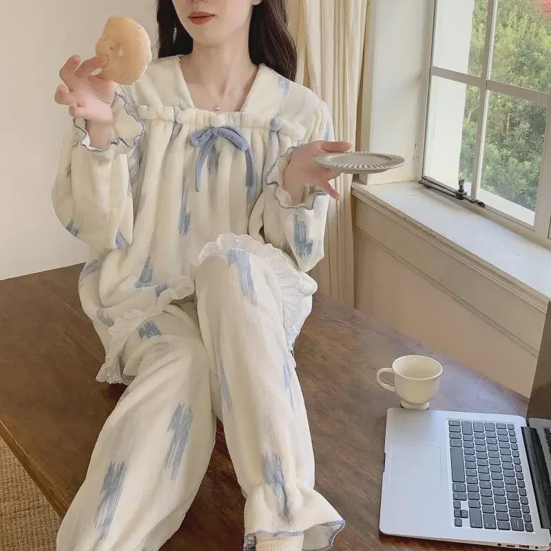 Dámské zimní flanelové pyžamo: Dlouhý rukáv, Teplý, S plusovým sametem, Ležérní domácí oblek