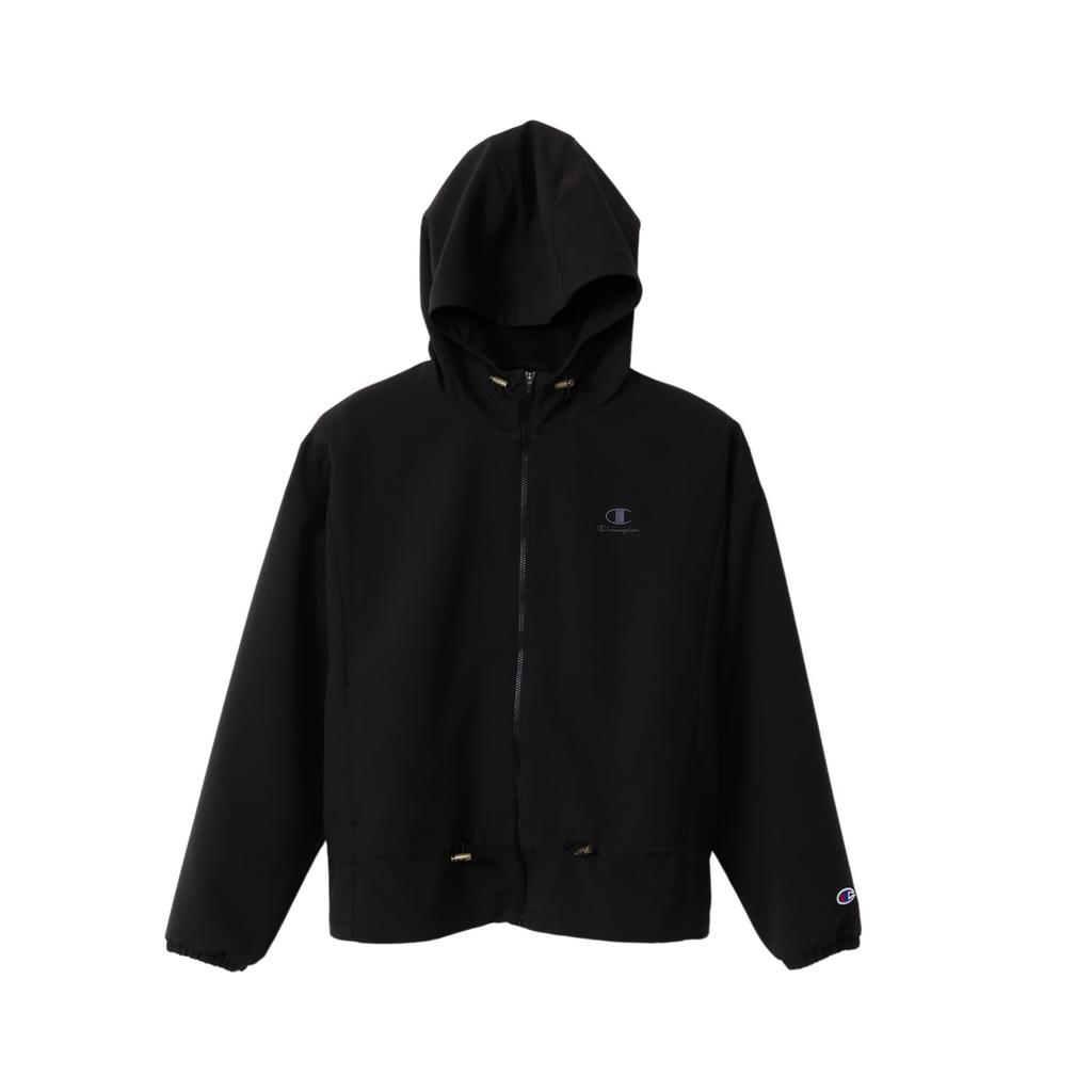 Dlouhá vodní bunda s kapucí a jedním bodem na zip, černá [Champion], rukávy, strečová, repelentní, větruodolná, logo, dámská sportovní bunda, CW-ASC02