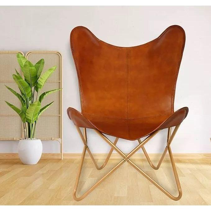 Add a touch of retro charm to your indoor or outdoor space with this handmade vintage leather butterfly relax armchair from . The chair features a sturdy Iron frame and leather cover made from 100% genuine buffalo leather and a firm canvas upholstery fabric with a unique pattern. This accent chair from the Home Decor Furniture product line has a Western and Butterflies theme. It is perfect for indoor and outdoor use and can be placed in various rooms such as the living room, bedroom, home office, or garden. This armchair is also eco-friendly and easy to carry for weekend getaways. This chair will surely be a standout piece in your home decor collection. Care instructions include cleaning with a cotton cloth and wax, and avoiding washing, bleaching, ironing, dry cleaning, and tumble drying. With a height of 36 inches, length of 29 inches, and width of 23 inches, this chair is suitable for teens, babies, kids, and adults alike. Get ready to relax in style with this classic leather butterfly chair.