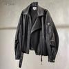 OFTBUY Dámská vintage volná krátká bunda z umělé kůže s páskem na motorku, dámská retro moto bikerská bunda, svrchní prádlo, topy