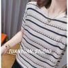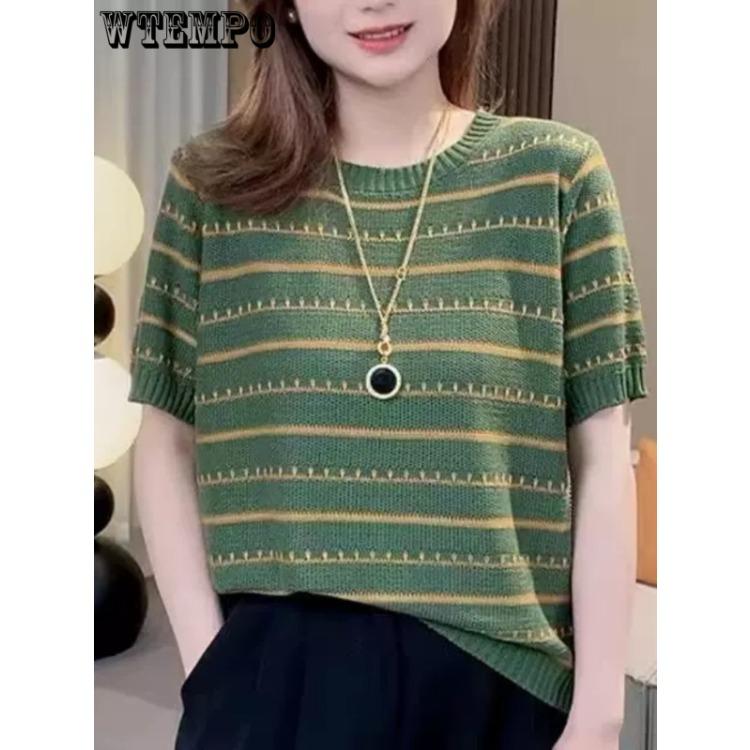 Striped Short Sleeved T-shirt Knitted Sweater Summer Contrasting Retro Loose Versatile Top for Women