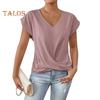 Dámské topy s výstřihem do V, s krátkým rukávem, s mačkaným designem, tričko jednobarevné, volného střihu, s křížovým plisováním, pro každodenní nošení
