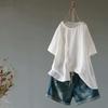Jaro Léto Jednobarevné Krátký rukáv Košile s kulatým výstřihem Knoflíček Up Tričko Čistá bavlna Len Dámské oblečení