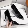 2025 summer new black patent leather high heels stiletto temperament square head French girl professional fashion single shoes women