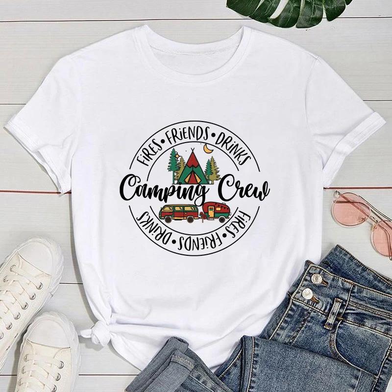 (Premium T-shirt)Fires Friends Drinks Camping Crew Letter Print T Shirts With Funny Saying Girls And Women'S Fashion Graphic Tee