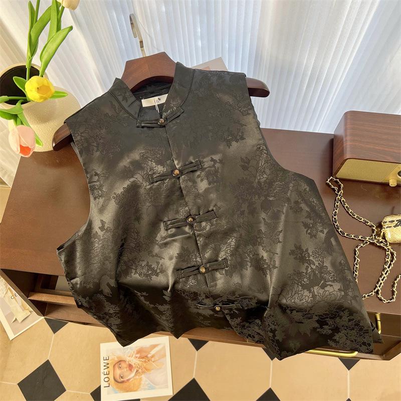 2024 Vesta bez rukávů v čínském stylu: Těžký morušový hedvábí Xiangyunsha s tmavým vzorem, stojáčkem, rozparkem na knoflíky na boku pro ženy.