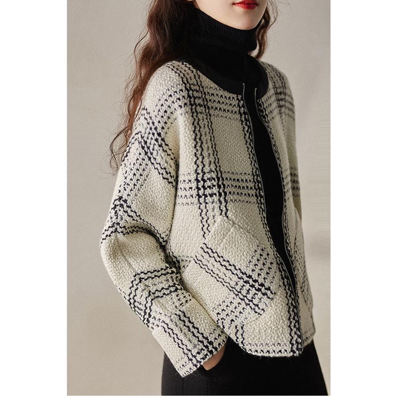 Elegant Black and White Checkered Bat Sleeve Wool Coat