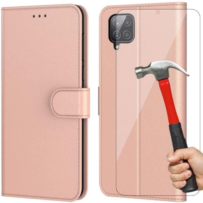 Coque et Verres Trempés - Booling - pour Samsung A22 4G - Rose - Effet Cuir - Anti Rayure