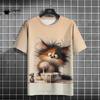 Cat printed T-shirt, Fun animal 3D printed short sleeved T-shirt, Large casual T-shirt