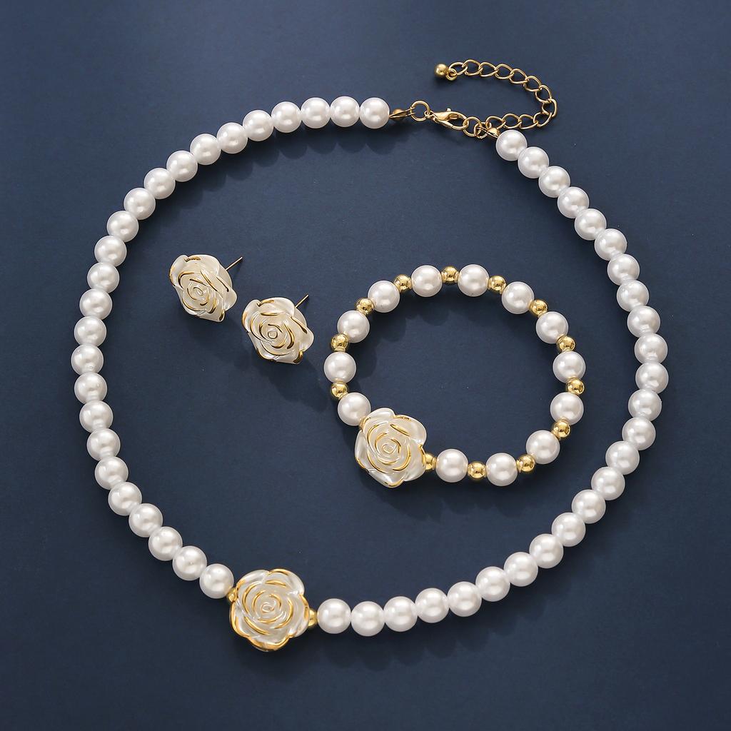 Ladies Pearl Camellia Necklace & Bracelet & Ear Stud Jewelry Set