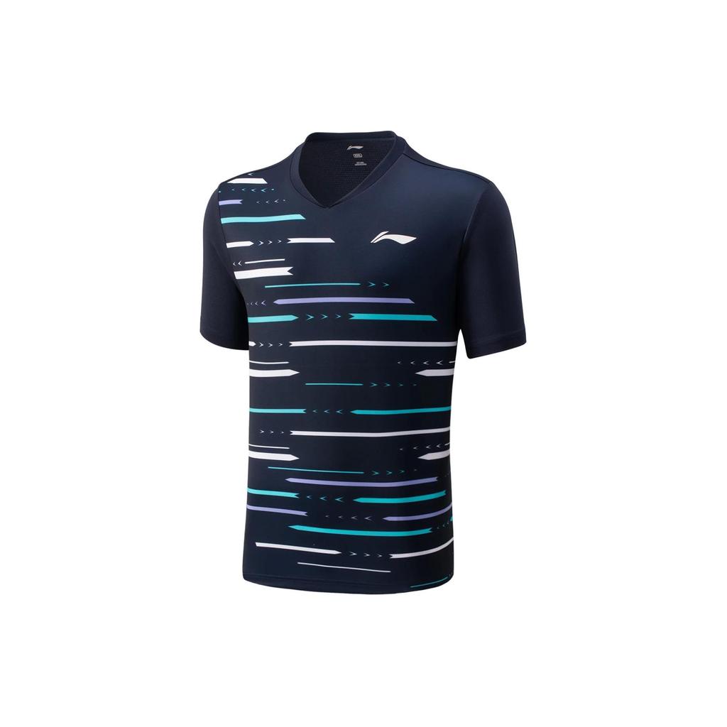 Li Ning Badminton Series Striped V-Neck Competition Sports Short Sleeve T-Shirt Unisex Tops Ink-Blue AAYU155-1