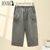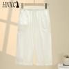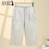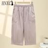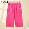 HNXC Summer Women Elastic Waist Straight Trousers Middle Age Older Women High Waist Straight Pants Washed Cotton Cropped Plus Size Pants