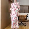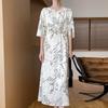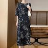 Unique French Printed Round Neck Short-sleeved Dress with Temperament and Gentle Waist Style Women's Satin Midi Skirt