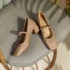 Sheepskin square head thick heel single shoes women's medium heel soft leather grandma shoes one-word buckle Mary Jane shoes spring and autumn