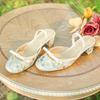 New Chinese embroidered round head sandals for women wearing high heels, thick heels, sheepskin, elastic band slippers summer