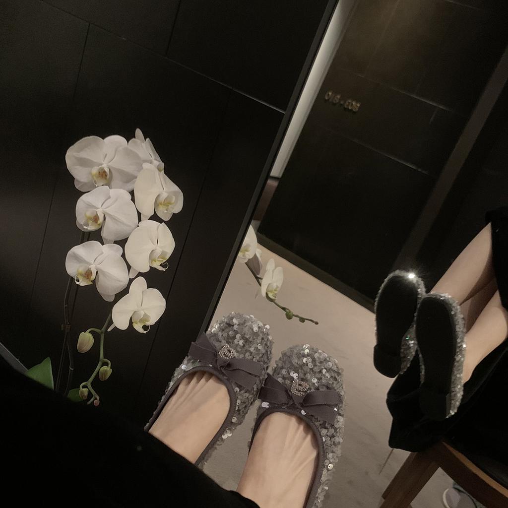 Shallow mouth sparkling beads bow temperament small thick sole one pedal single shoes female winter