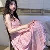 Růžové plisované pruhované šaty na ramínka pro léto pro ženy, nový francouzský pas a štíhlý temperament, velká kolová sukně