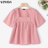 VONDA Women Girls Summer Square Collar Short Sleeve Buttons Casual Ruffled Blouse