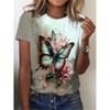 Živé tričko s potiskem motýlů s kulatým výstřihem Měkký mírně pružný polyester Běžný střih Krátký rukáv Jaro a léto Dámské ležérní oblečení