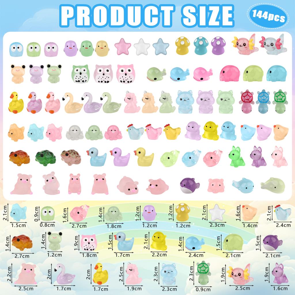 Balíček obsahuje: Obdržíte 144 kusů miniaturních pryskyřičných zvířátek v různých stylech, včetně pryskyřičných kachen, hub, žab, želv, dinosaurů, káčátek, delfínů, velryb, chobotnic, slůňat, hvězdic, štěňat, kuřátek, veverek, sov, ropuch, žab, selátek, jednorožců a plameňáků atd.. Množství je dostatečné, tvary jsou malé a roztomilé a barvy jsou bohaté, což postačuje k uspokojení vašich různých kreativních a dekorativních potřeb.