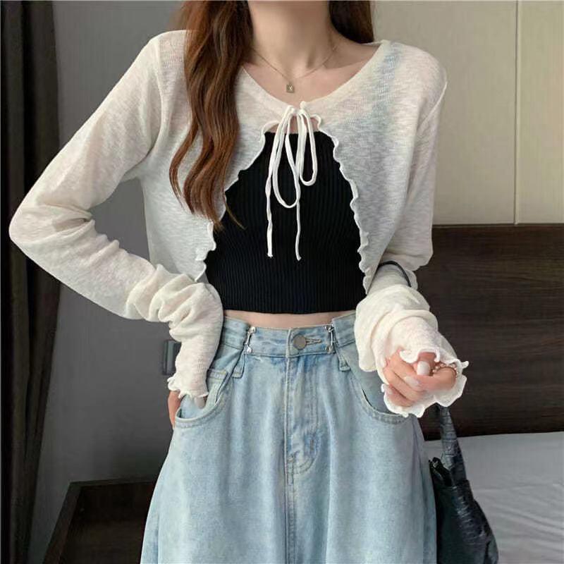 Dámský letní kardigan v korejském stylu - Ochrana před sluncem, Tenká pletenina, Dlouhý rukáv, Stahovací šňůrka, Krátká šála.
