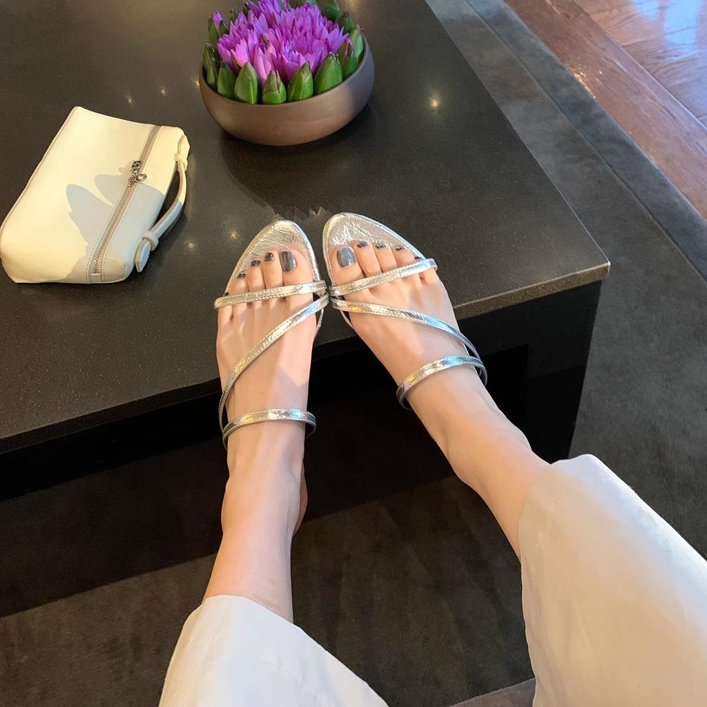 Sheepskin version~ New temperament pointed leather round head open-toed thin strap small heel sandals women's summer slippers