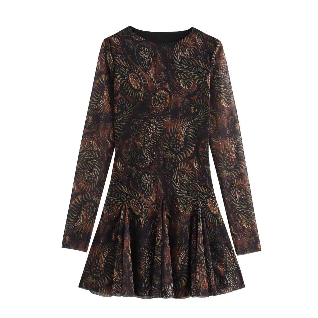 2024 Autumn Women's European & American Print Silk Waist-Hugging Long-Sleeve Short Dress