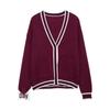 2025 Spring V-Neck Dark Red Color Block Stripe Knit Cardigan - European & American Style