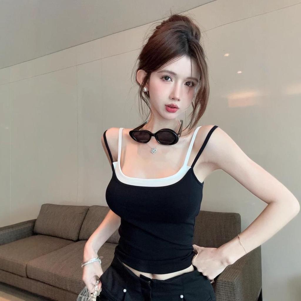 Dámské černé falešné dvoudílné tílko s vycpávkami na prsou - Unikátní thajský design, Sladký a pikantní krátký top