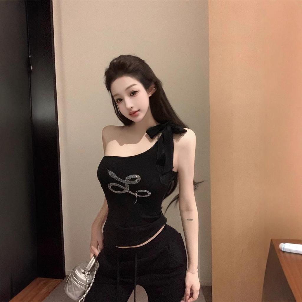 Šik Černý Kamínkový Top na Jedno Rameno - Dámský Letní Bezrukávový Tílko