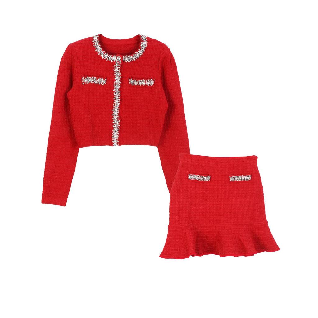 Elegant French-style Cardigan & Short Skirt Set with Red Diamond Accents