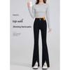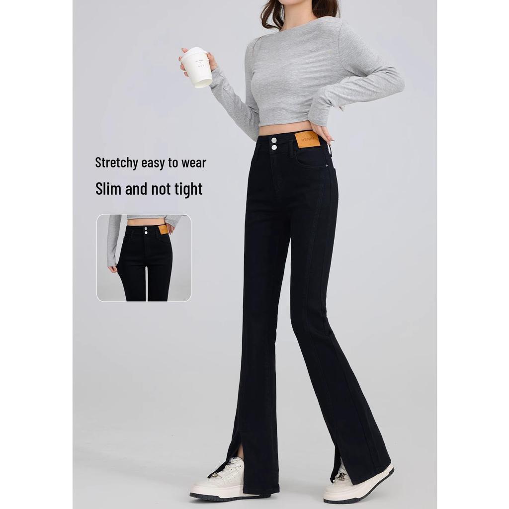 Discover the elegance and style of our Women's High-Waisted Black Micro-Flare Jeans from the 2025 Early Spring Collection. Crafted from cotton stretch denim, these jeans provide maximum comfort and a flattering fit. The high waistline enhances your silhouette, while the slimming, slim-fitting design offers a chic appearance. Featuring a sporty flair with a unique horseshoe split at the hem and practical pockets, these jeans seamlessly blend fashion and functionality for any casual outing.