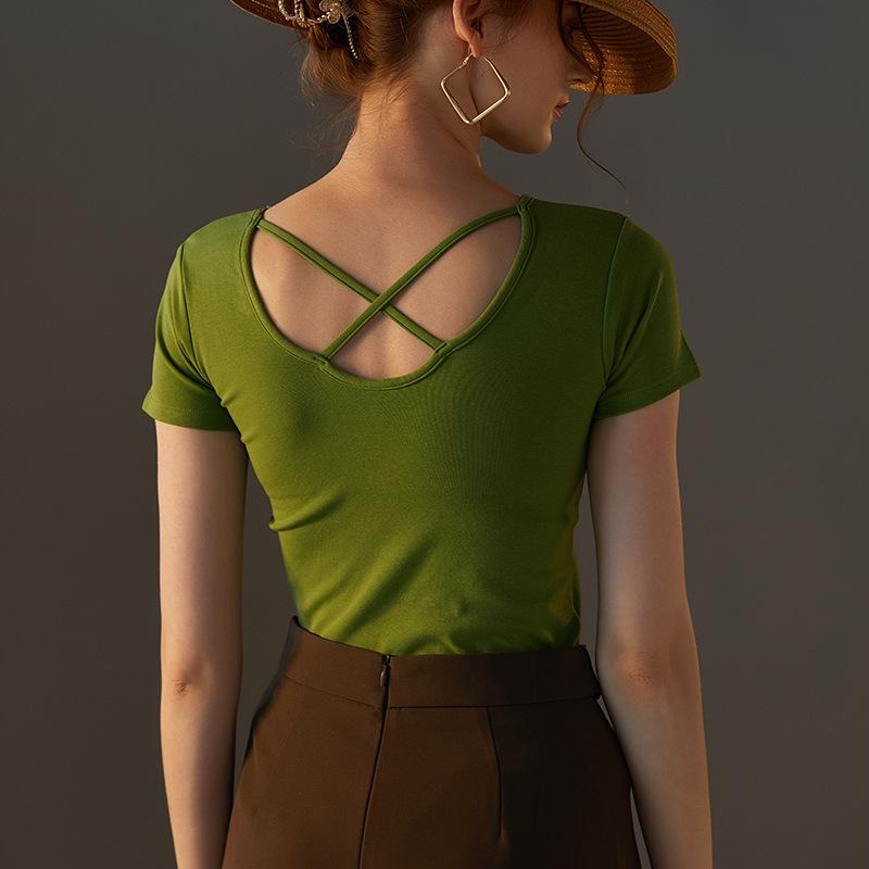 Dámské tričko s krátkým rukávem bez podprsenky - Čistá bavlna, Všitá podprsenka, Krásná záda, Zeštíhlující střih, Letní top