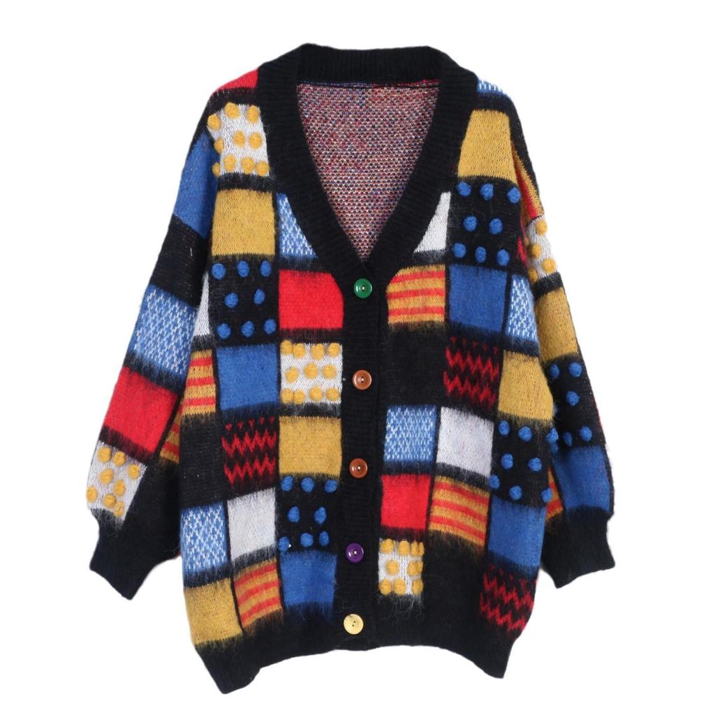 Korean Retro Color Block Plaid Mohair V-Neck Knit Cardigan Sweater with Pom Poms