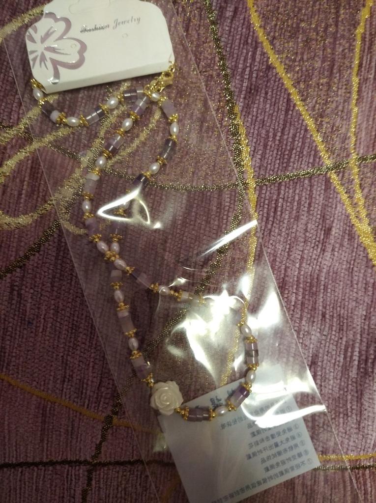ModelFialový aventurínový náhrdelník s květinou z mušle