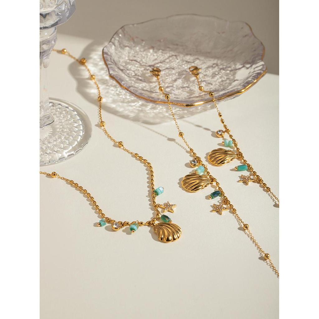 Francouzský Retro 18k Zlato & Nerezová Ocel Amazonit Mušle Hvězda Přívěsek Náhrdelník - Lehký Luxusní Šperk