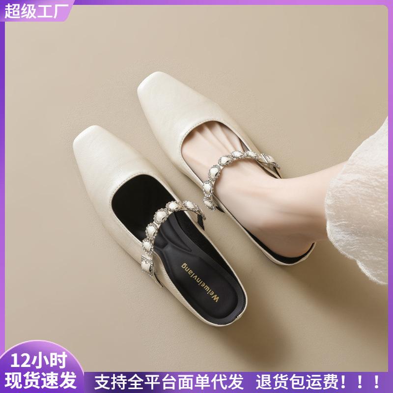 Baotou half slippers, women wear rhinestones outside summer, lazy people pedal thick-heeled cool slippers