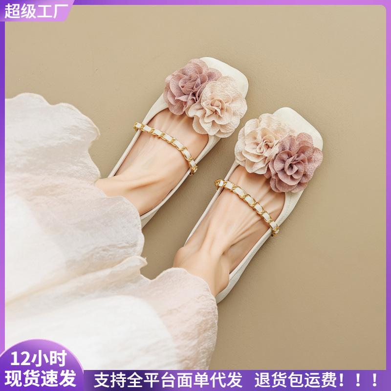 Square head single shoes women's flat bottom shallow mouth word with flower shoes women