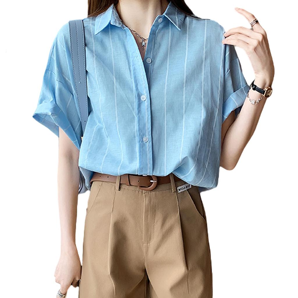 Blouses for short dress cut and body large loose for office [Merelop Ceto] women, shirts, stripes, sleeves, tops, shirts, fashion, sewn, covering,