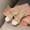 Sandals women's rhinestone word with thick heel new silver sandals
