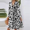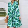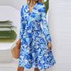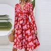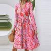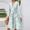 Dámské módní ležérní šaty midi s výstřihem do V, dlouhým rukávem, v pase a s květinovým potiskem