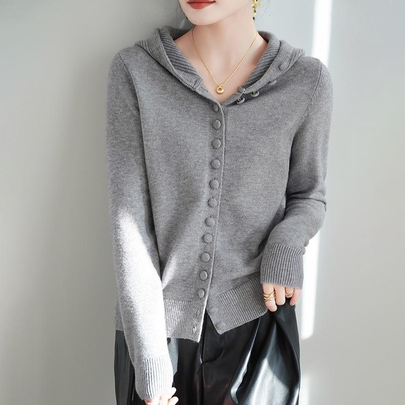 New Spring and Autumn Women's Knitted Sweater with Thickened Wool Buckles, Hooded Cardigan and Solid Color Casual Hoodie