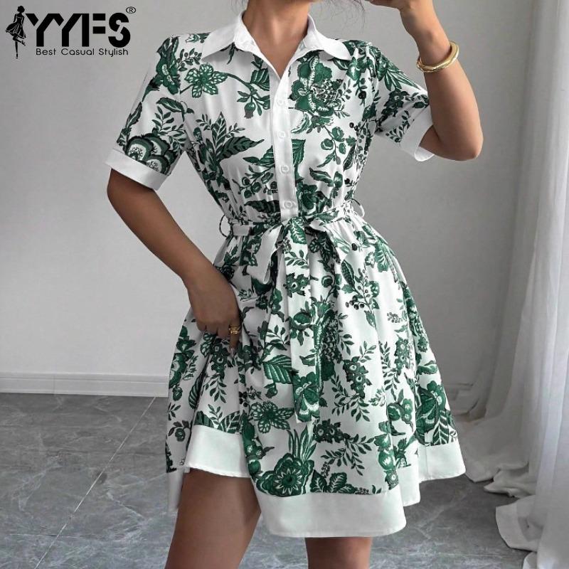 YYFS Women's Fashion Summer Spring Flower Pattern Print Short Sleeve POLO Neck High Waist Casual Dresses