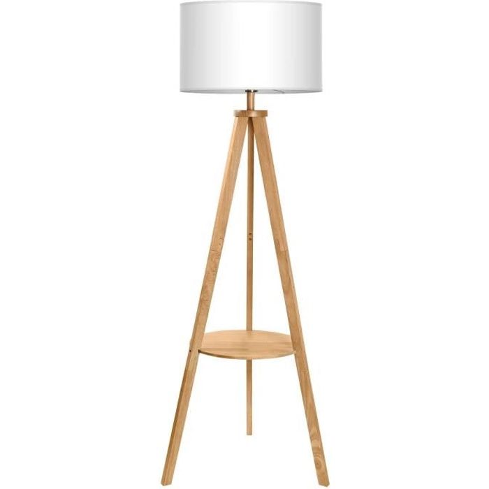 Lampadaire Trépied en Bois TOMONS avec Tablette et Ampoule E27 8W - Style Scandinave