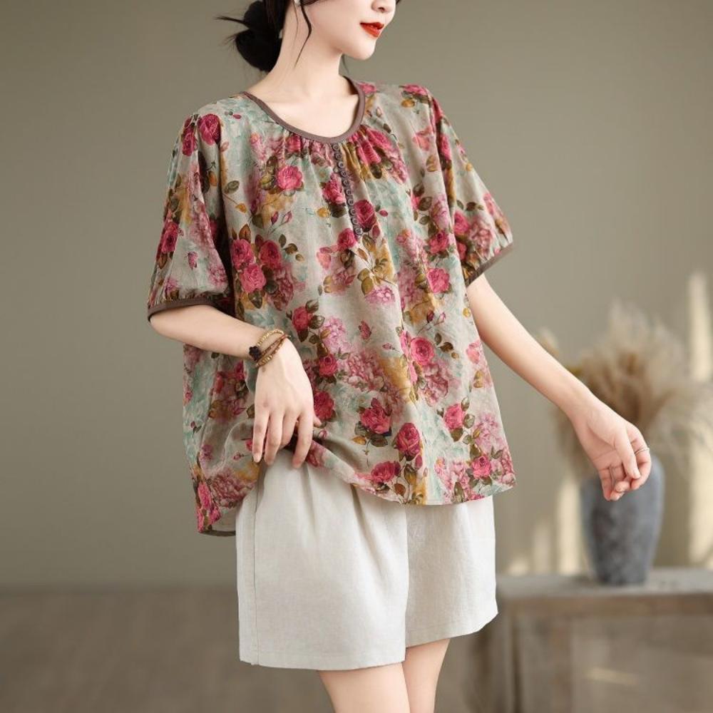 Summer Thin Printed Color Pullover Short Sleeved Shirt Artistic Retro Loose Bubble Cotton Linen T-shirt Top