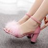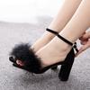 7cm Thick Heel Shallow Mouth One-length Strap Feather Sandals Round Toe Square Root Fashionable Casual Summer Sandals Large Size